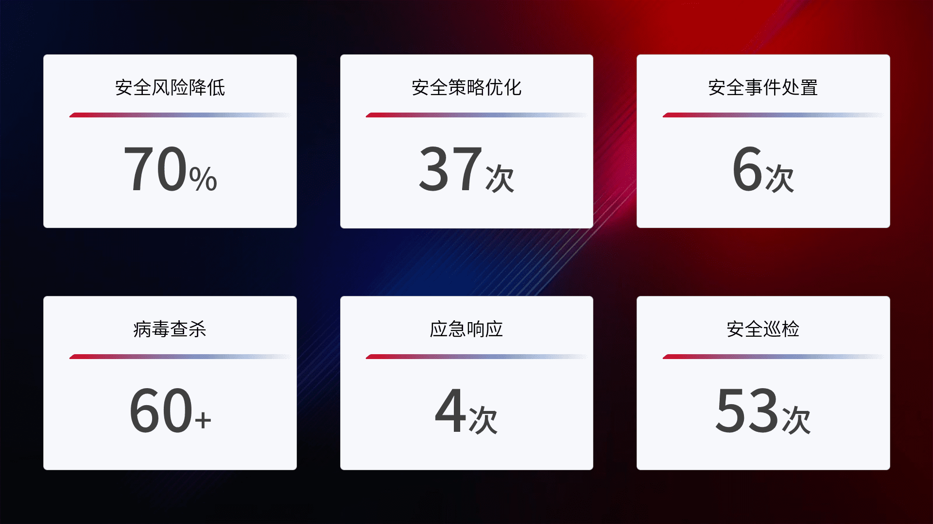 提供全面的安全事件报告体系,,包括处置报告、、、周报、、季度和年度总结,,,结合持续监控,,帮助客户深入了解网络安全状况。。。