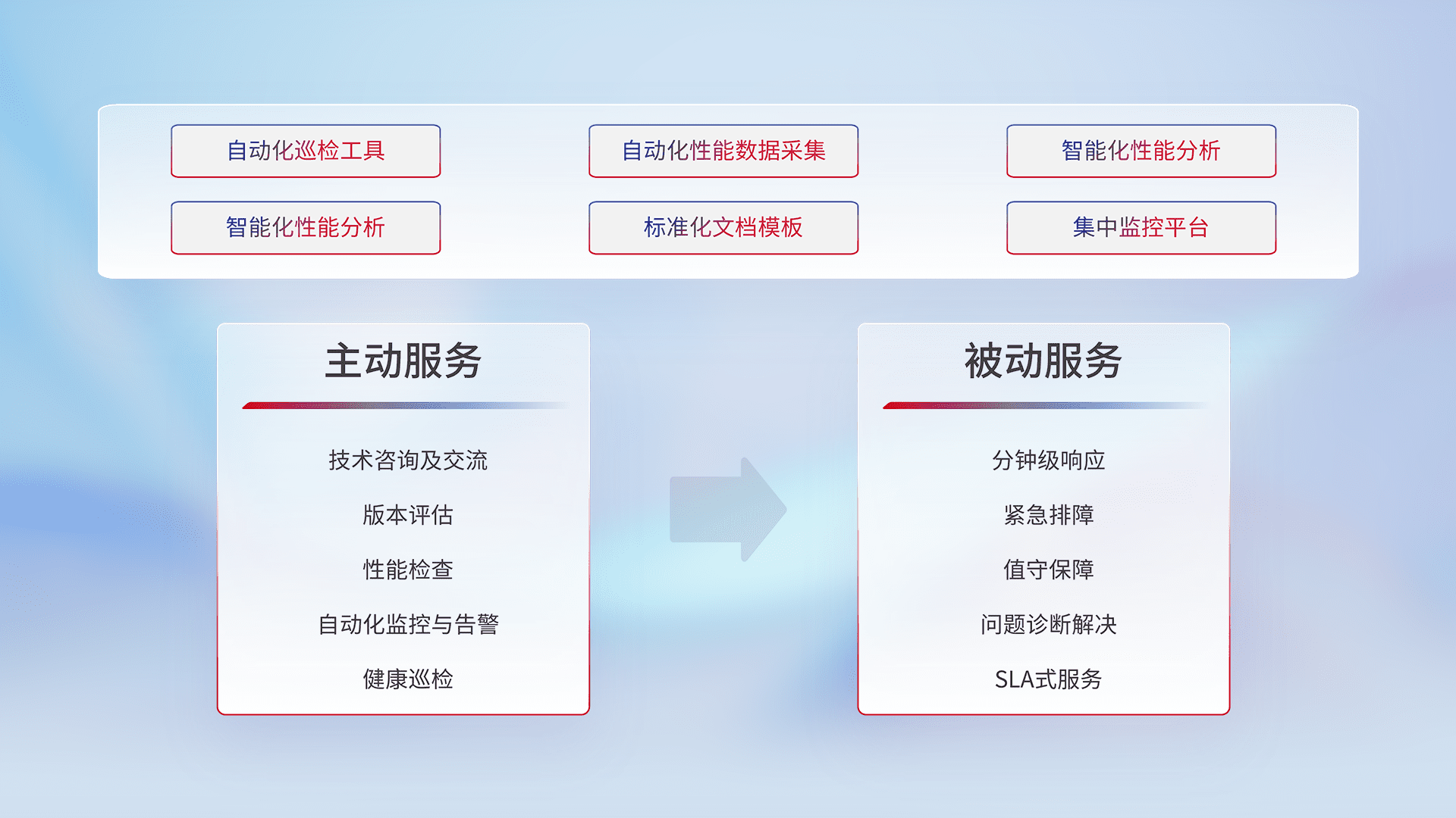 智能化工具和标准化文档,,保障服务质量,,,,提供主动服务(包含技术咨询、、版本评估、、、性能检查、、自动化监控与告警、、、健康巡检)和被动服务包含(分钟级响应、、紧急排障、、、、值守保障、、、、问题诊断解决、、SLA服务)。。。