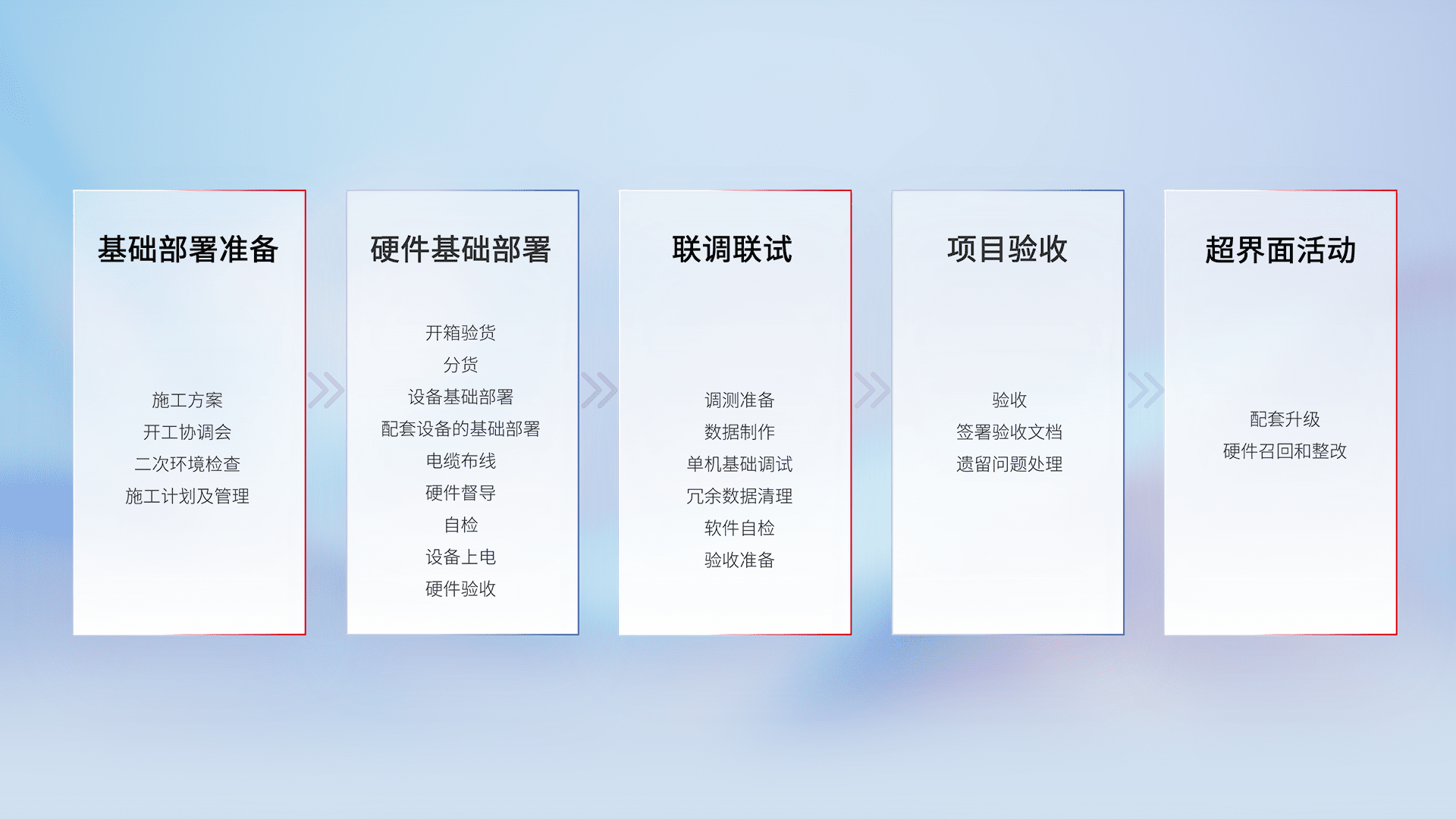 从基础部署准备、、硬件基础部署、、联调联试、、项目验收、、越界面活动的全过程可追溯,,,保证施工质量和进度。。