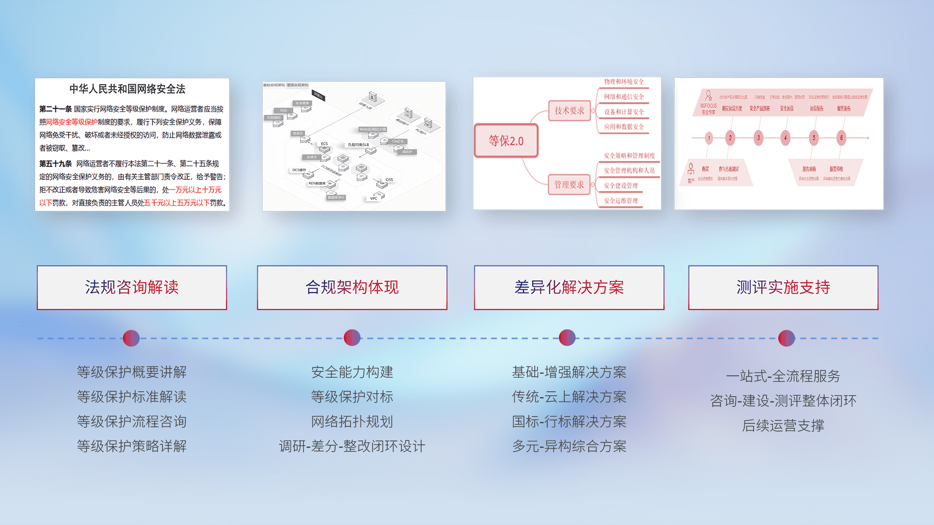 通过专业的法律咨询解读、、合规架构体现、、、差异化解决方案、、、测试实施支持等服务,,,,为客户量身打造等保合规体系。。。